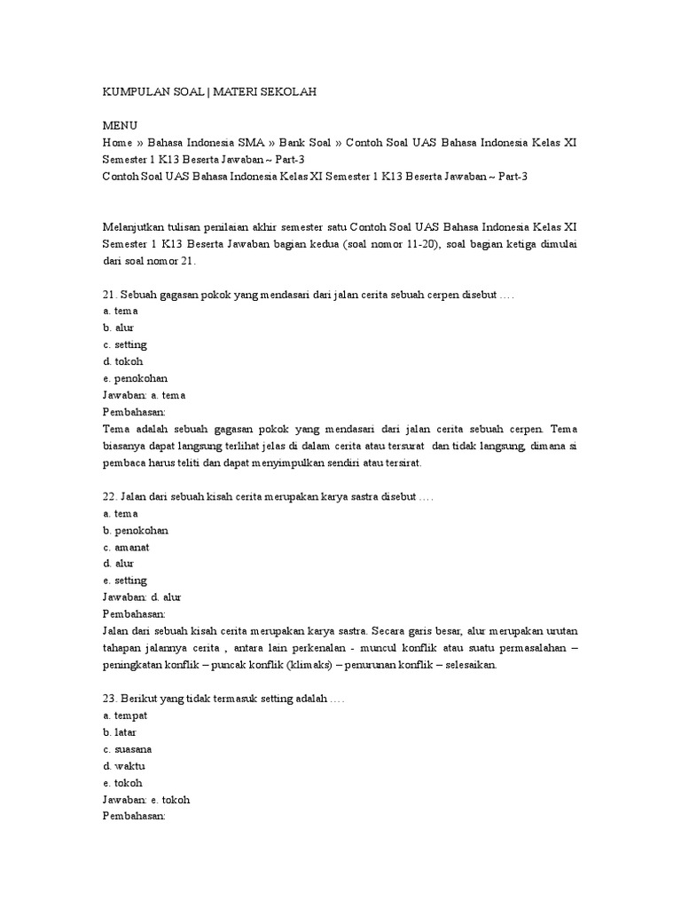 Berikut ini adalah contoh soal bahasa indonesia pilihan ganda kelas 8 k13 semester 1 dan jawabannya. Berikut ini adalah contoh soal uas/ pas k13 kelas 6 semester 1 tema 3 muatan pelajaran bahasa indonesia. 1 dari 7 konon tersebutlah seorang raja yang bernama prabu baka.beliau bertahta di prambanan.raja ini seorang raksasa yang menakutkan dan besar kekuasaannya.meskipun demikian,kalau sudah takdir,dan akhirnya dia kalah juga dengan raja. Inggris kelas 11 sama dalam bentuk essay: