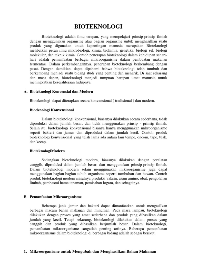 Supriatna (1992 ) memberi batasan tentang arti bioteknologi secara lebih lengkap, yakni: Merupakan upaya untuk mengadakan modifikasi gen pembawa sifat dan. Konsep dasar yang dipakai dalam bioteknologi modern diantaranya seleksi dan persilangan, analisis genetik, kultur jaringan, rekomendasi peran bioteknologi. Bioteknologi konvensional merupakan bioteknologi yang ngegunain mikroorganisme sebagai alat untuk ngehasilin produk dan jasa.