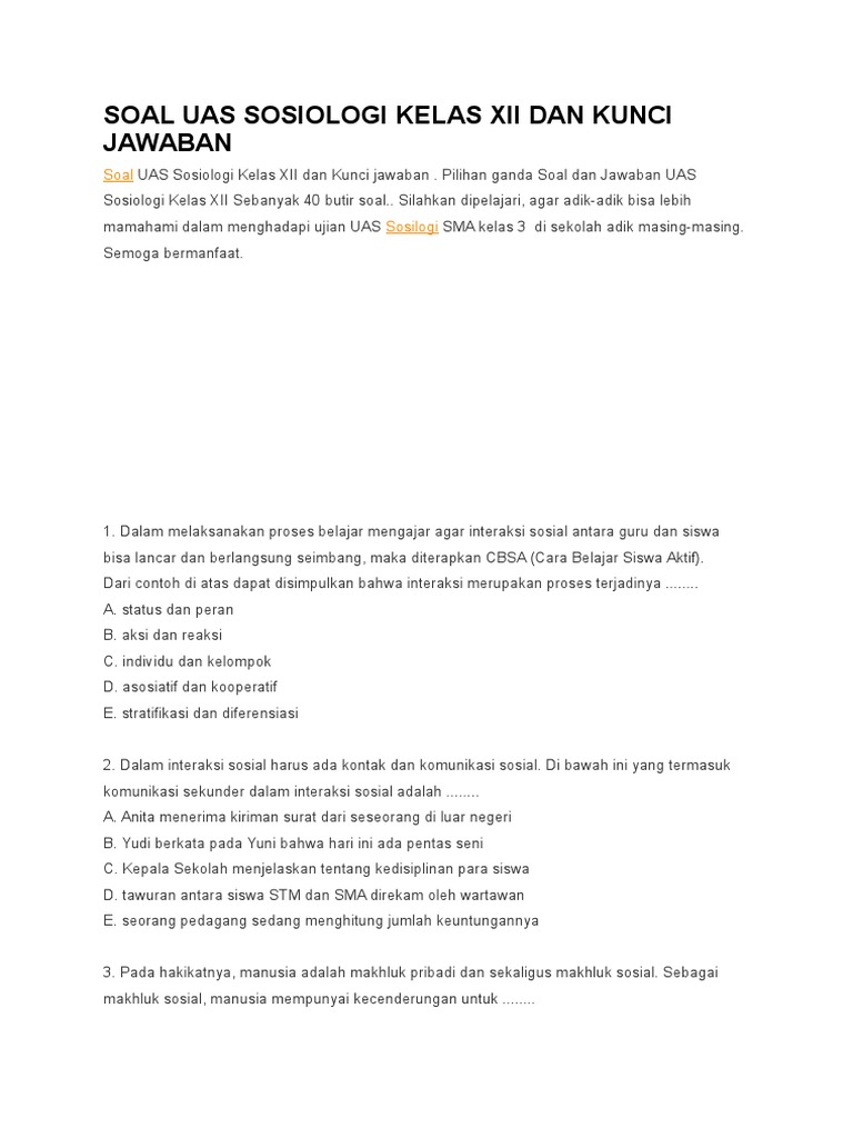 Hai sobat pada kesempatan kali ini admin akan membagikan latihan soal uas sosiologi kelas 12 semester 1 dan kunci jawaban lengkap terbaru untuk tahun ajaran 2020/2021 dengan kurikulum 2013 sebagai acuannya.