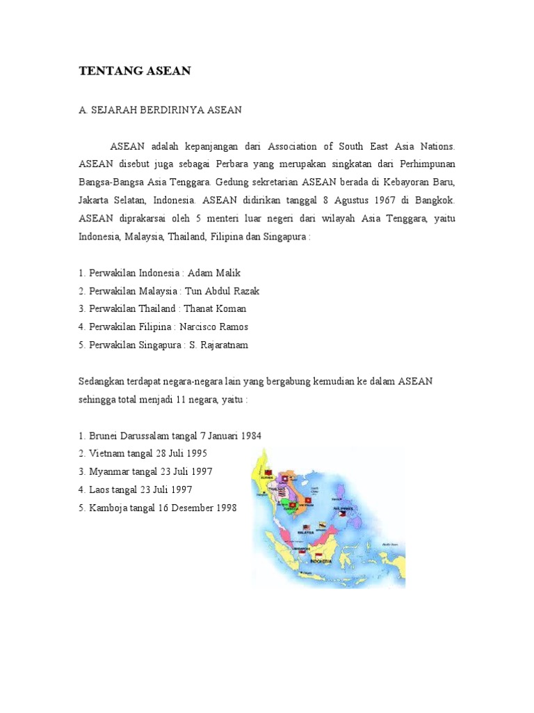 Asean adalah kepanjangan dari association of south east asia nations. Asean didirikan pada tanggal 8 agustus 1967 di kota bangkok. Afta dibentuk pada waktu konperensi tingkat tinggi (ktt) asean ke iv di singapura tahun 1992. Keempat pendatang baru tersebut dibutuhkan untuk menandatangani persetujuan afta untuk.