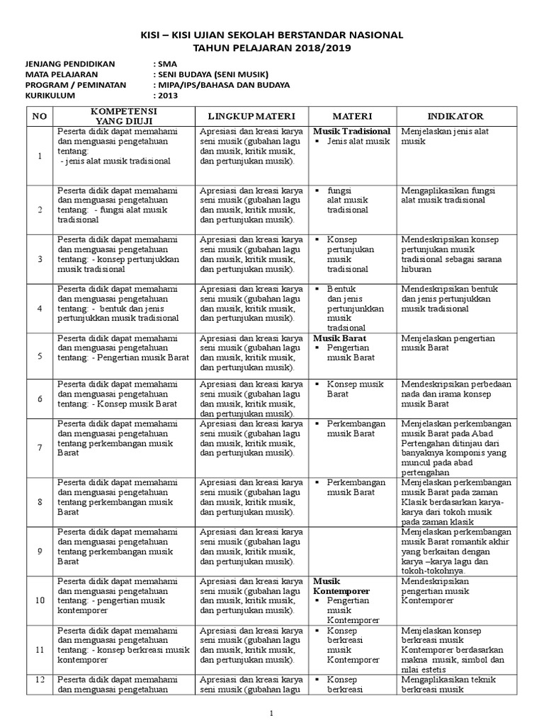 Format Kisi Kisi Soal Usbn 2019 Kur 2013 Seni Budaya Musik from imgv2-2-f.scribdassets.com Contoh soal penilaian tengah semester mata pelajaran sbk kelas xii tentang seni rupa dan seni musik ini, berisikan materi seni budaya yang diambil dair bab 1, apresiasi karya seni rupa sampai soal tentang apresiasi karya seni musik bab 2. Cakupan materi pada bab 12 ini adalah mengetahui jenis musik ansambel tradisional dan memainkan ansambel tradisional. Demikian artikel pembahasan tentang pengertian seni budaya menurut para ahli, macam jenis.